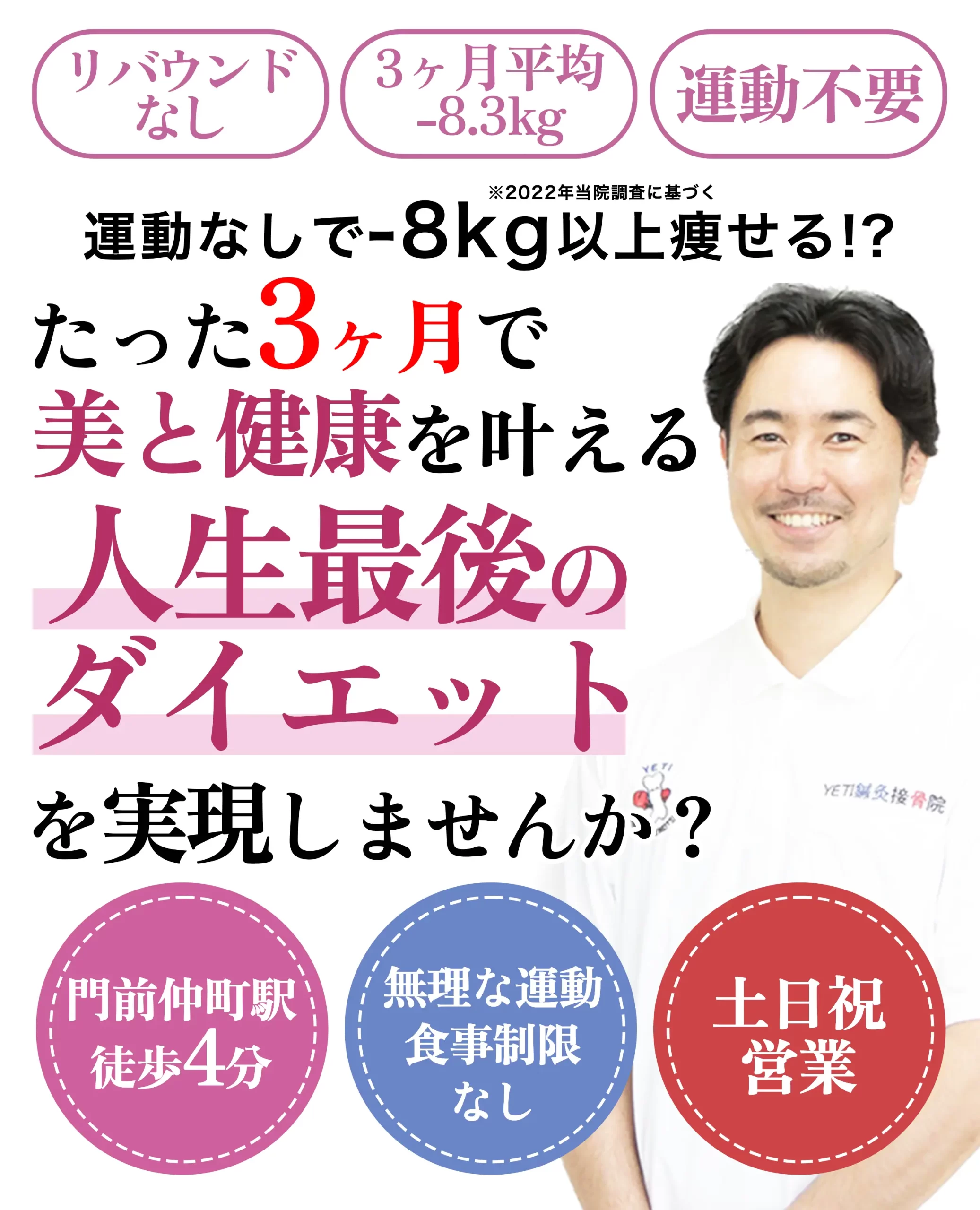 本当に痩せたいとお悩みの方は、ぜひ一度門前仲町イエティ鍼灸整骨院様を頼られてはいかがでしょうか?